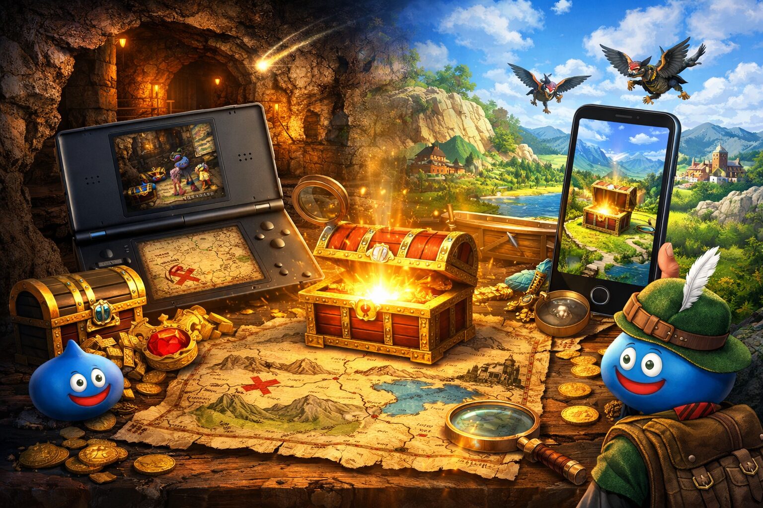 最後にまとめると、ドラクエの宝の地図はひとつの言葉に見えて、作品ごとにまるで別の遊びです。DQ9では、場所を探して洞窟に入り、青箱やボス周回で価値を積み上げる自動生成ダンジョン型。ドラクエウォークでは、受け取り、導きのかけら、こころ集め、ご当地、魔王の地図まで含めた常設クエスト型。ここを切り分けるだけで、検索の迷子はかなり減ります。