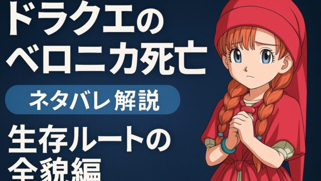 ドラクエのベロニカ死亡をネタバレ解説。生存ルートの全貌編こんにちは。はぐれドラクエおっさんです。ドラクエ11を遊んでいて、ベロニカの死亡イベントにショックを受けた人、多いですよね。ドラクエのベロニカ死亡は本当なのか、いつ起きるのか、復活や生...